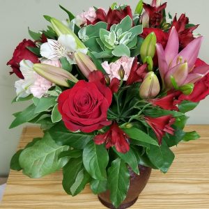 Recommended Budget $75.00Let us create a Custom Design in your price range using a mix of colors and flowers. Starting at $65. We have vases, baskets and unique containers to create a one of a kind piece. You can be assured the recipient will not receive another just like the one we will custom make. NOTE photos are ONLY to show examples of our work most shown are priced at $55-85. Because we are designs are custom, we do not offer a click on a photo and buy website. Use the notes if you have special requests of colors and flowers, we will do our best to accommodate.